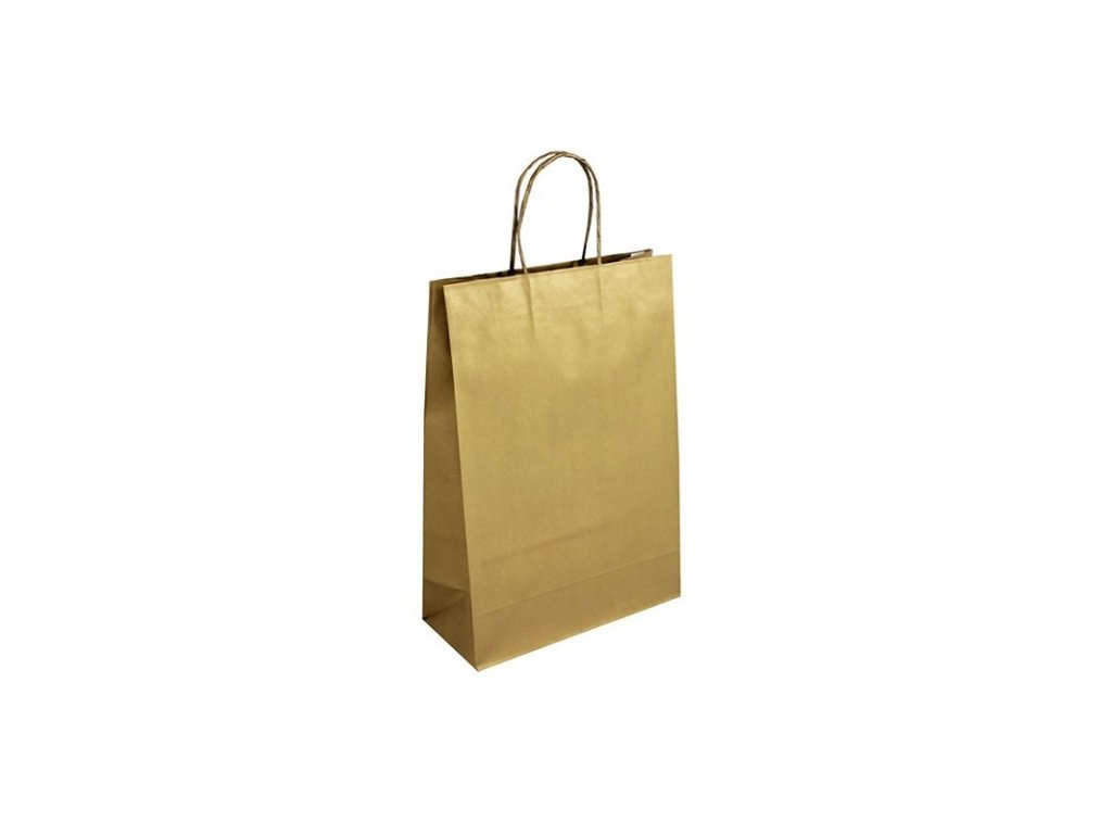 Elegantní zlatá taška s krouceným uchem a vrchní částí zahnutou dovnitř v rozměru 25 x 11 x 36 cm. Taška je vhodná i na vánoční dárky jako lahev vína s lahůdkami.