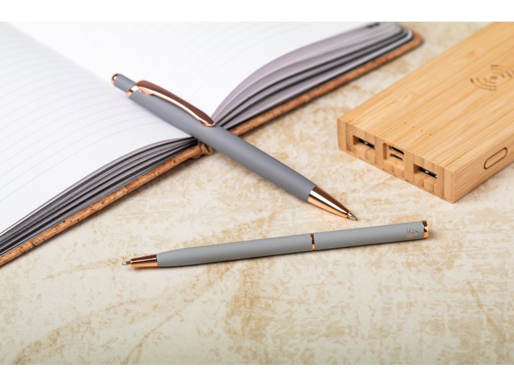 Kuličkové pero z recyklovaného hliníku s pogumovaným povrchem a detaily z růžového zlata. Se speciální povrchovou úpravou pro zrcadlové laserové gravírování v barvě růžového zlata (gravírované logo nebo motiv bude v barvě doplňků propisky). S modrou náplní.